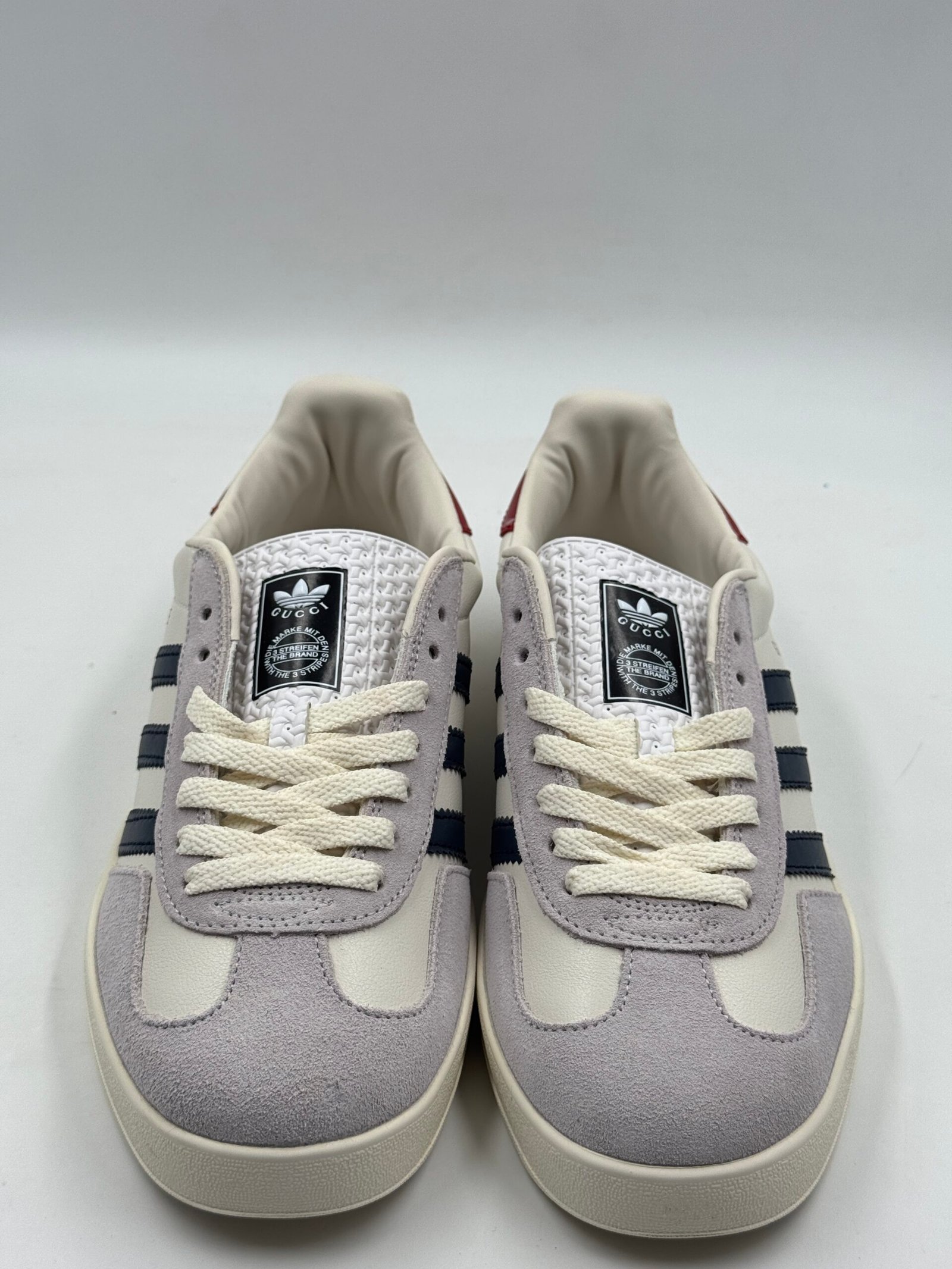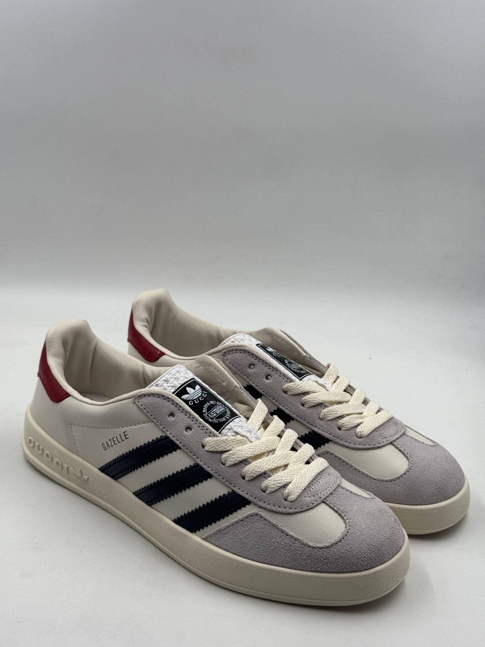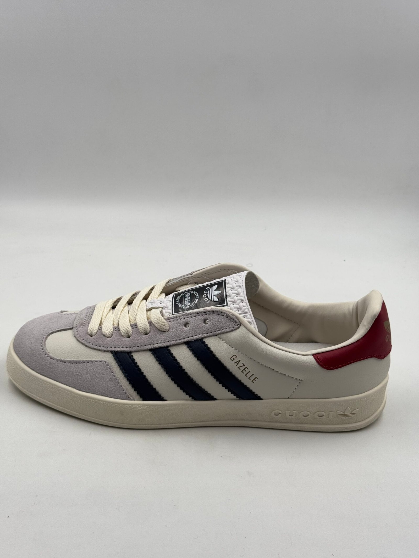 The Adidas x Gucci Gazelle sneakers blend Adidas’s classic silhouette with Gucci’s luxury flair. Featuring premium materials, bold colorways, and dual branding, they reimagine the iconic Gazelle with high-fashion appeal.