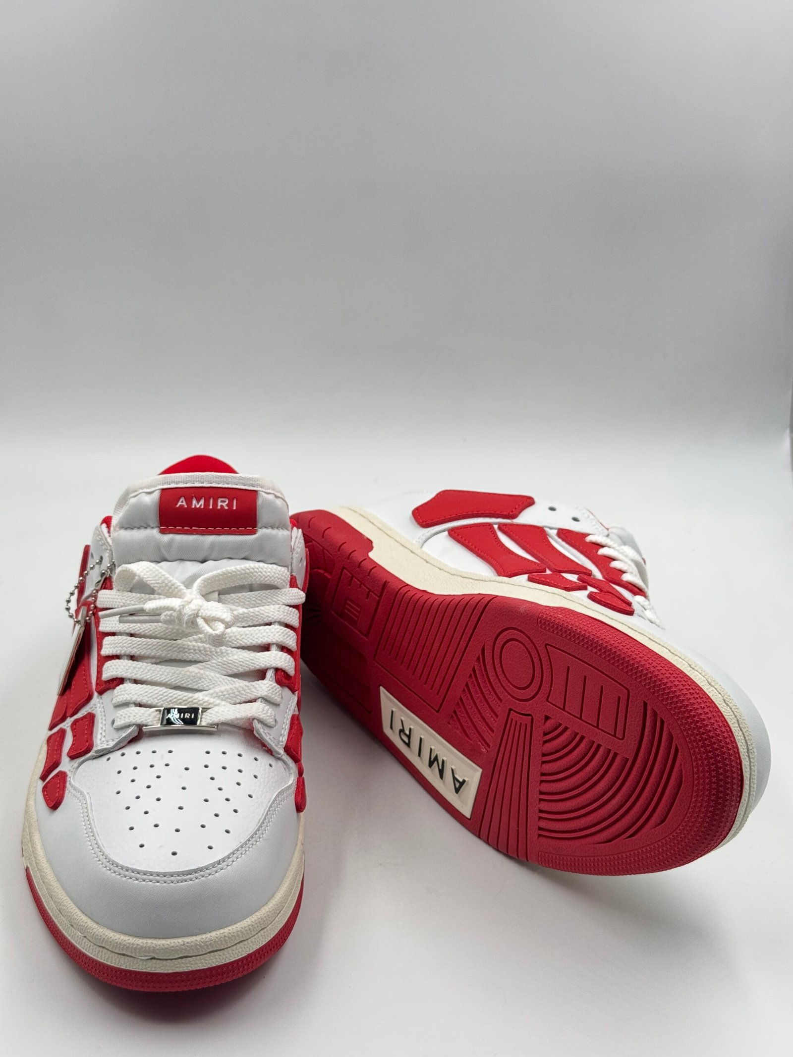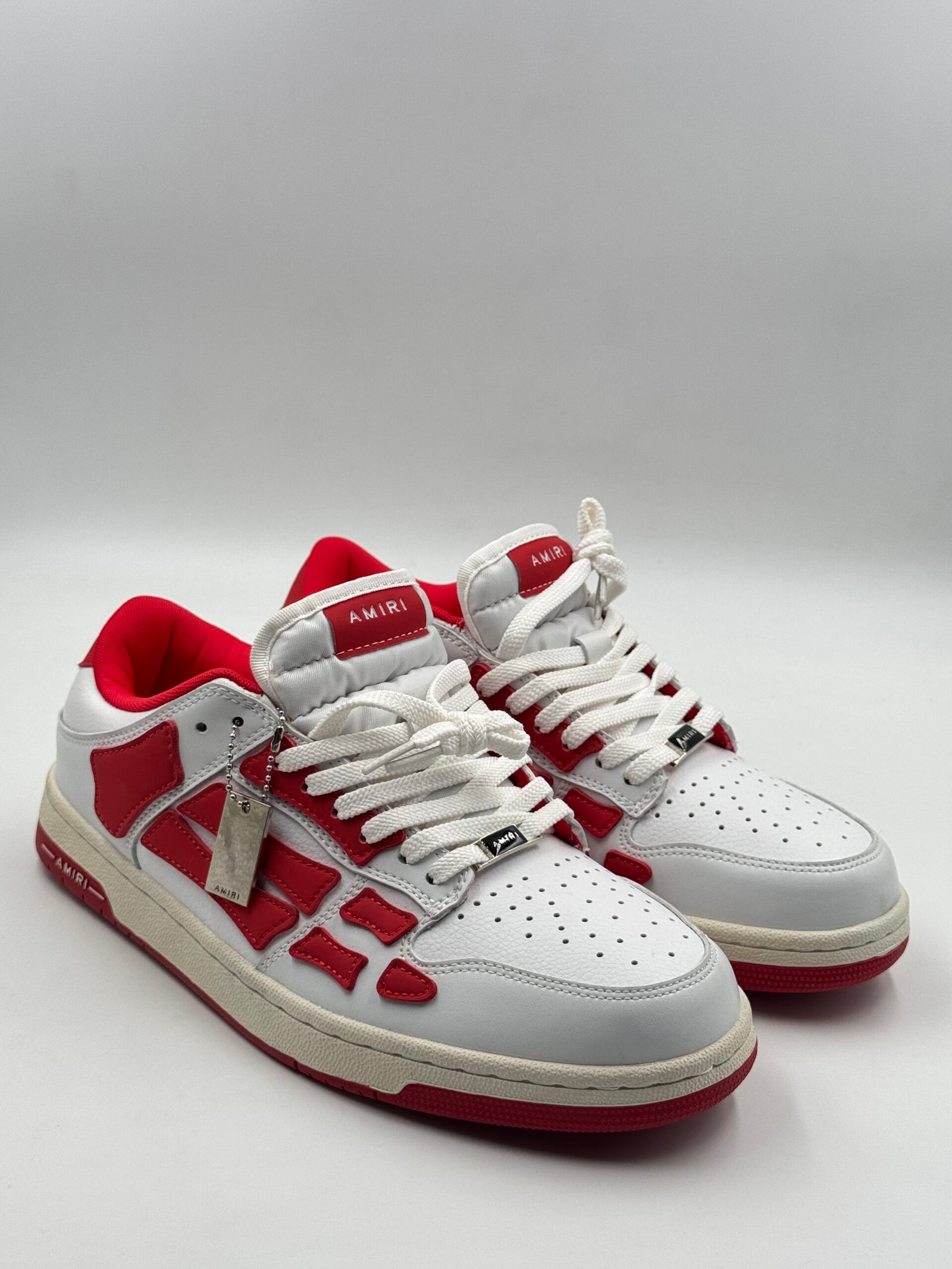 The AMIRI Skel Top Low White/Red is a premium low-top sneaker that combines luxury craftsmanship with streetwear aesthetics. Featuring a white leather upper accented with red panels, perforated detailing at the toe, and signature graphic appliqués at the sides, this sneaker offers both style and comfort.